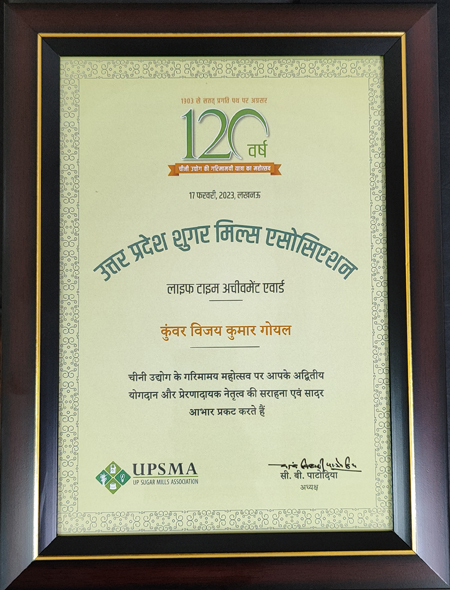Our Chairman, Mr. Vijay Kumar Goel was felicitated with Lifetime Achievement Award for his contribution towards sugar industry by U.P. Chief Minister Shri Yogi Adityanath ji. The event was organized by U.P. Sugar Mills Association (UPSMA) and was held in Lucknow on 17th February 2023, on the occasion of 120-year celebration of UP sugar industry.